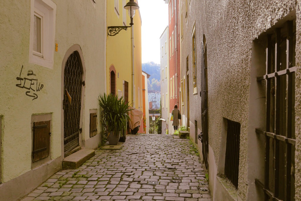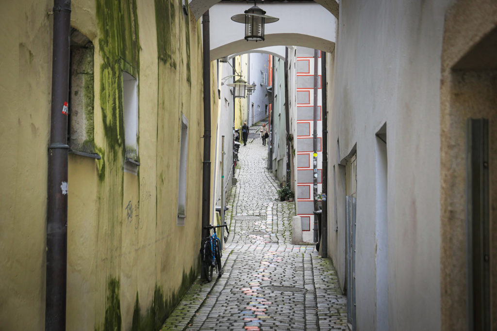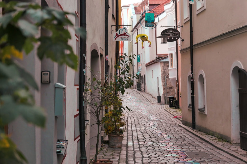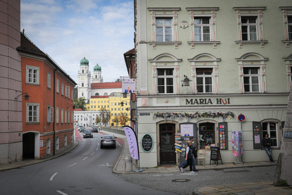 Auf einer langgestreckten Halbinsel zwischen den beiden Flüssen liegt die Passauer Altstadt – und die lädt mal so richtig zu einem ordentlichen Bummel ein. Die engen Gassen, die schiefen Häuser erinnern an so manches mediterrane Städtchen. Dazu kommt, dass es direkt nach der Uferpromenade der Donau steil bergauf geht, sodass die ein oder andere Treppe erklommen werden muss, will man zum Dom. Und zum Dom muss man! Er thront hier über allem und ist in seinem unschuldigen Weiß ein wahrer Blickfang.