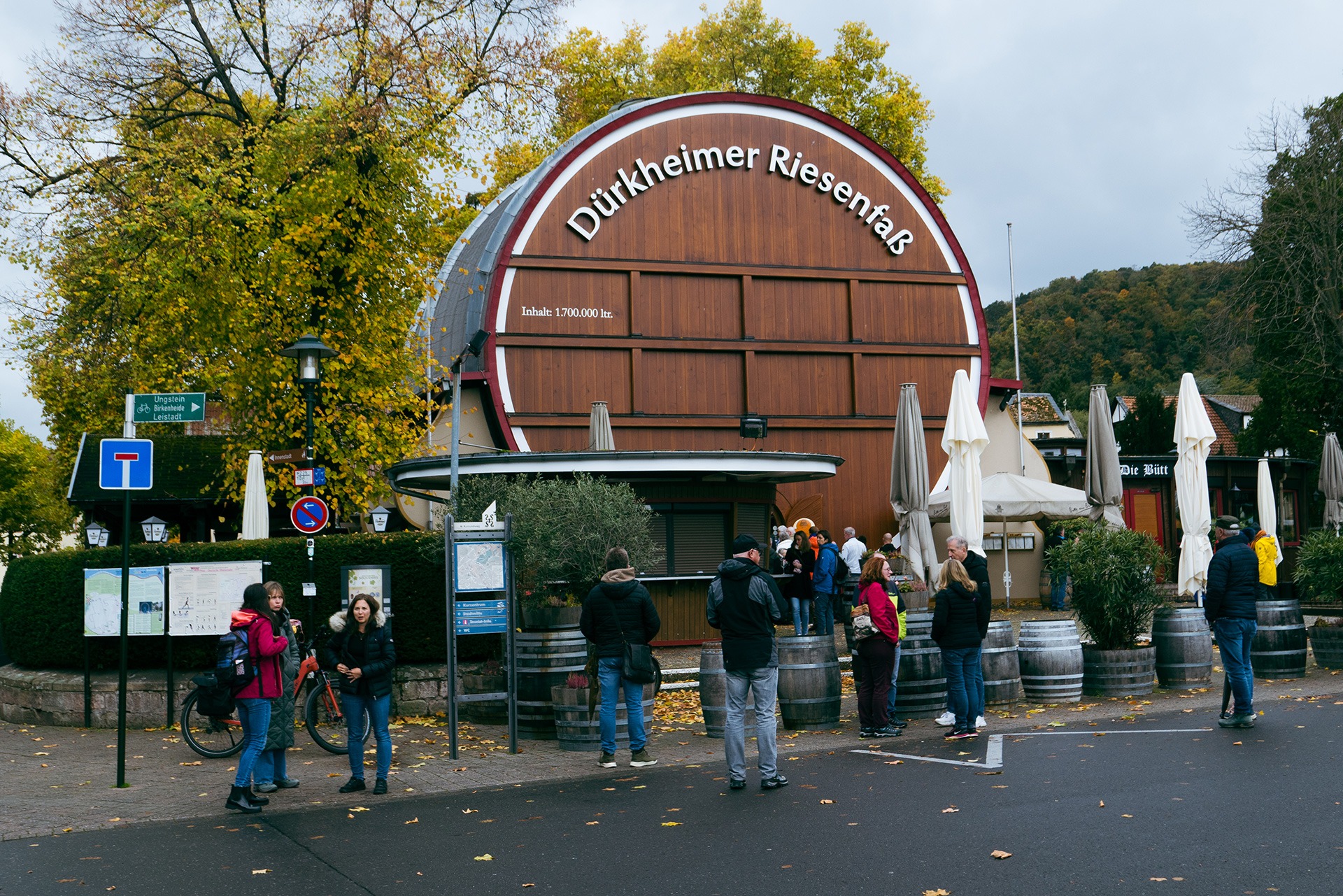 Erlebt man Bad Dürkheim Ende Oktober kann man sich diese Massen an Leuten nur schwer vorstellen. Denn das Städtchen, das in etwas auf halber Strecke zwischen Kaiserslautern und Ludwigshafen liegt, wirkt eher verschlafen. Selbst um die andere Attraktion der Stadt – das Dürkheimer Riesenfass – bleibt der Touristenstrom an diesem letzten Oktoberwochenende überschaubar. Das 1934 erbaute Fass hat bei einem Durchmesser von 13,5 Metern ein Fassungsvermögen von 1,7 Millionen Liter und ist damit das größte Fass der Welt. Allerdings wird es nicht etwa zur Lagerung von Wein oder anderen Flüssigkeiten benutzt, sondern beherbergt eine Gaststätte.